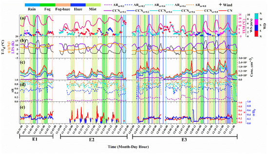 Time series of hourly-averaged (a) temperature (TEM), wind direction (WD) and wind speed (WS), (b) low tropospheric stability (LTS) and specific humidity (q), (c) number concentrations of condensation nuclei (CN) and cloud condensation nuclei (CCN), (d) aerosol activated ratio (AR) and (e) hygroscopicity (κ) and chemical heterogeneity (σ/Dc) of particles during three typical low-visibility event periods (E1: 31 October to 2 November, E2: 19 November to 24 November and E3: 3 December to 12 December). The background colors refer to the type of weather conditions.
