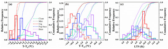 The radiation cooling of fog and mist can be quantified using T-T12. T-T12 showed distinct features according to weather types as well. About 94% of the fog and mist events had negative T-T12 values, mostly less than −8 °C, providing evidence of the impact of terrestrial energy release on the formation of radiation fogs at night [57,58]. The T-T12 of the fog–haze events were mostly between −6 and −4 °C, with a maximum frequency of 21%, indicating that fog–haze was partly influenced by radiation cooling. When haze occurs, it usually occurred during the daytime, and its corresponding T-T12 was almost always positive (0–8 °C). When fog occurred, frequencies tended to concentrate at LTS larger than 9 K (79%), showing higher stability than other LVEs. LTS for haze events was relatively small, with an average of 6.24 K, even less than for clean events (7.63 K). The stable atmosphere restrained the vertical mixing of particulate matter and water vapor, conduced to gather particles and droplets within the boundary layer, and then formed haze or fog events and maintained them.