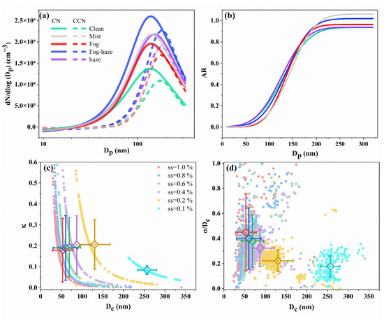 The averaged (a) size distributions of condensation nuclei (CN) and cloud condensation nuclei (CCN) and (b) size-resolved particle activation ratio. (c) Particle critical activation diameter (Dc) vs. aerosol hygroscopic growth parameters (κ) and (d) heterogeneous parameters (σ/Dc) derived from CCN activation curves at different supersaturation (SS). The error bar represents the standard deviation of parameters at different SS.