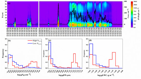 Temporal variations of (a) fog droplet concentration and size distribution on 1 and 2 November and (b–d) probability distribution of the fog droplet concentration (Nd), equivalent diameter (ED), and liquid water content (LWC) for the high NCCN (>75th percentile) and low NCCN cases (<25th percentile).
