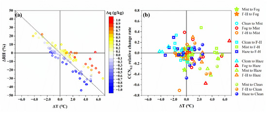 (a) Response of relative humidity change (ΔRH) to temperature change (ΔT) and specific humidity (Δq) change during the evolution of LVEs. (b) Scattering of temperature difference (ΔT) vs. CCN0.2 relative change rate in the evolution of LVEs. The abbreviation for fog–haze event is F-H.
