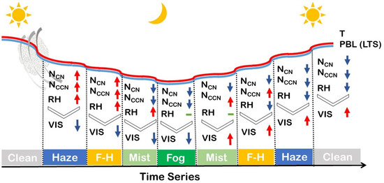 Figure 7 shows a conceptual model of the ideal evolution of LVEs. Most haze or fog–haze events occurred before or after sunset and were associated with aerosols transported from external sources. The decreasing temperature and boundary layer height then caused an increase in relative humidity and an accumulation of particulates near the surface. With rising aerosol hygroscopic growth, atmospheric visibility decreased rapidly, and at the same time, droplets and dry particles coexisted to form fog–haze events. Through condensation and absorption of water vapor, more CCN became droplets, and the fog–haze events turned into mist or fog events, resulting in a decrease of 0.96 km or 4.99 km in visibility, respectively. The increasing temperature resulted in the fog event transitioning to mist or haze after sunrise. In the afternoon, fewer LVEs occurred due to the increasing height of the boundary layer and turbulence enhancing the diffusion of pollutants.