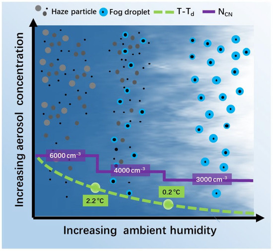 Figure 8 illustrates how the LVEs developed with these two drivers. All LVEs benefited from increased aerosol concentration, while fog events were promoted by increased ambient humidity. Mist or fog formed when T-Td dropped below 0.2 °C, and NCN rose to 3000 cm−3, while haze formed when T-Td exceeded 2.2 °C and the NCN rose twice (6000 cm−3). The value presented here is based on the statistical analysis of this study. A larger number of field campaigns were needed to investigate whether this threshold was universal for regions and seasons beyond Shanghai. However, this conceptual model and threshold will be extremely valuable in understanding the formation, evolution, and transition of LVEs.