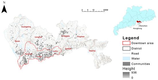 Shenzhen is near Hong Kong and is part of the Pearl River Delta. Shenzhen has become one of China’s most populous and inventive cities since the Special Economic Zone was established in 1979. Although Shenzhen’s urban spatial structure is polycentric, there is a clear difference in urban development between the north and the south, based on the central boundaries of the city. At the end of 2020, the city covered an area of 1995 km2, 980 km2 of which were built-up areas, and the city’s resident population had reached 17.6 million; with the city’s built-up area greening coverage rate of 43.38%, and a built-up area green space rate of 37.36%, the greening indicators ranked among the top in the country [54]. Hundreds of parks of various types were established by the end of 2021, compared to only five parks at the start of the reform and opening-up (Late 1978).