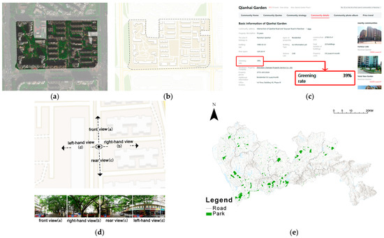 Data sources:(a,b) Amal’s green spaces in the communities, (c) a page on the housing website (FANGTIANXIA) showing community information, which includes the community green space ratio, (d) green spaces in Baidu Street—view images, (e) park from Baidu Map.