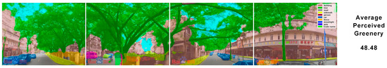 The pyramid scene parsing network (PSPNet) is a pixel-level object detection and classification method that generates solid semantic segmentation results, with pixel-level accuracy of more than 80.2% [57]. It has been applied by several prior studies [54,55,56] to extract streetscape features such as trees, sky, and building views from SVIs to inform the urban environment [58], housing prices [50], and urban design [59]. We used PSPNet to extract the pixel ratios of individual features as view indices from SVIs (144, 810 images), and more than 30 elements were detected (Figure 3). Perceived greenery can be defined as urban greenery’s overall visual contact intensity in a live scene. The formula is as follows: