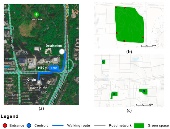 Accessibility indicators describe the distance from the community to the nearest park. As the location of households in each community varies, when regarding departure points, using the community center point as the departure point can be considered the average location for all community residents to depart from. Regarding destinations, we defined the centroid and entrances of green spaces as destinations according to the level of the green space [17,60,61]. The destinations of community parks (area < 5 ha) and municipal parks (area ≥ 5 ha) were established as the centroids and entrances, respectively (Figure 4b,c).