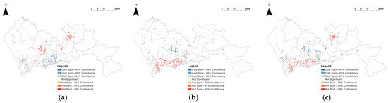 Hotspot analysis of community green exposure, in terms of (a) community green space ratio, (b) GVI, and (c) park accessibility.