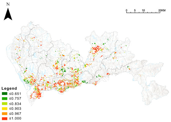 Using the baseline values of green space ratio, GVI, and accessibility, entropy values and weights were further calculated (Table 3). Finally, the comprehensive green exposure level was calculated for each community (Figure 7).