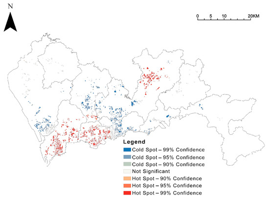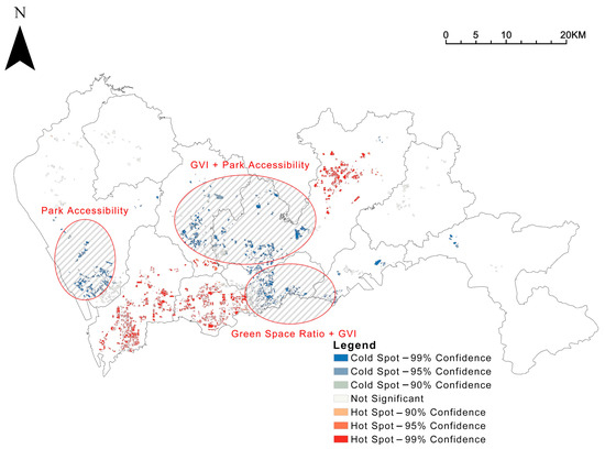 The spatial distribution of green spaces ratio, GVI, and accessibility was analysed in hotspots (Getis-Ord Gi*), and the results were visualized (Figure 6). The Luohu and Futian districts within the city’s central area and the Bao’an central area to the west of the central area have lower community green space rates. In comparison, the non-central areas generally have higher community green space rates. The results of GVI and accessibility are similar. Central area communities have mostly higher GVI and accessibility, and non-central area communities are generally weaker; however, there are exceptions with higher park accessibility in the Longgang central area communities.
