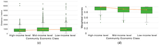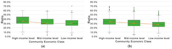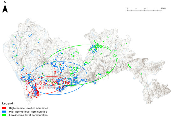 3281 communities were divided into five equal numbers of partitions [16,17]. Then, community prices in the brackets 80% and more, more than 20% and less than 80%, and up to 20% could represent high-income, mid-income, and low-income levels, respectively. Because of the high housing costs in Shenzhen, purchasers may spend a considerable amount of their income on the house [12,55,56]. Therefore, housing prices can be considered as an important factor reflecting people’s income and socio-economic position [12,55,56].