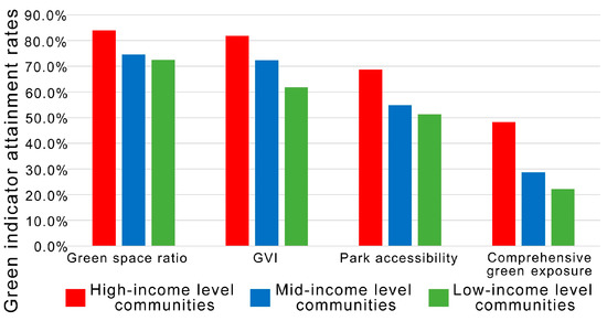 If the results of the chi-square test are not significant, the original hypothesis cannot be rejected. It indicates that high- or mid-income level communities tend to have no significant difference in the attainment level of green exposure from low-income level communities; conversely, if the results of the chi-square test are significant, the original hypothesis is rejected. It indicates that high- or mid-income level communities tend to differ significantly from low-income level communities in terms of their attainment level for green exposure.