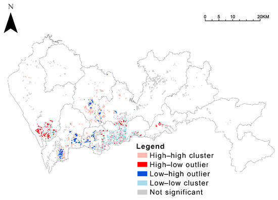 The values of bivariate Moran’s I range from −1 to 1. For the bivariate Moran’s I with statistical significance, the positive and negative values indicate spatial aggregation (positive spatial correlation) and spatial fragmentation (negative spatial correlation), respectively [65]. The cluster map resulting from the local bivariate Moran’s I can determine four kinds of spatial correlations at the community level: High–High type refers to high-age communities encircled by the high green space ratio, and so on.