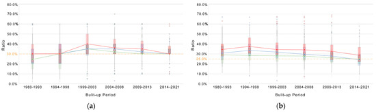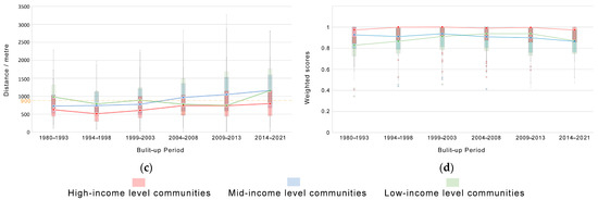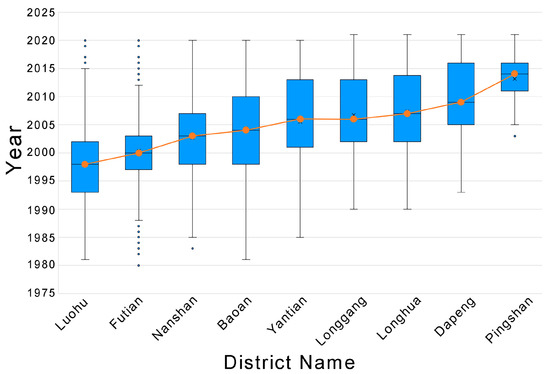 The particular year of housing reform, 1998, characterized by privatization and marketization, was used as the dividing point [12,16], followed by a 5-year cycle of grouping communities. On the one hand, this is because Chinese planning programs are based on a 5-year interval; on the other hand, it is because the number of communities built in some years is less and needs to be aggregated. The community was divided into six periods according to the time of completion: 1980 to 1993, 1994 to 1998, 1999 to 2003, 2004 to 2008, 2009 to 2013, and 2014 to present.
