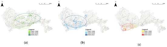 - Lefever, D.W. Measuring Geographic Concentration by Means of the Standard Deviational Ellipse. Am. J. Sociol. 1926, 32, 88–94. [Google Scholar] [CrossRef]