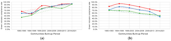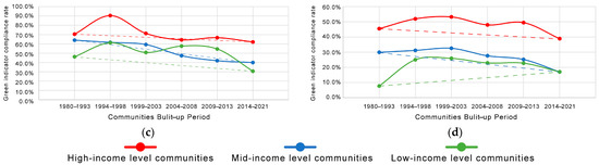 The community green space ratio is almost unchanged since the community was built, while the street greenery and parks (amount) are generally getting better all the time. Note that, due to the time limitation of street view images (SVIs) and park data acquisition, we only assessed the community green space by the current state of urban green space. Communities of different built-up periods were then grouped to compare their green exposure level.