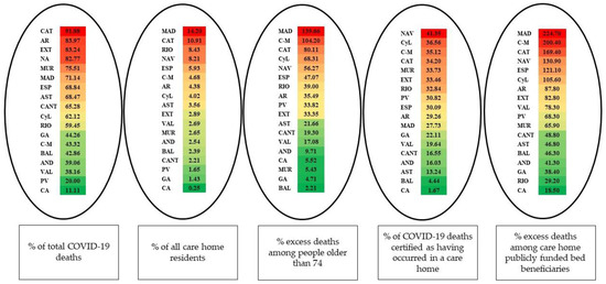 Autonomous Communities ranked by care home COVID-19 mortality indicators. Source: Authors’ work using the following data: the percentages of total COVID-19 deaths and percentages of all care home residents correspond to the period comprising 15 March to 21 June 2020. As regard to care home population the date varies depending on the source. For care home population and beds ACs provided data ranging from June 2020 to January 2021, whereas IMSERSO data [24] for Andalucía is from December 2019, and CSIC data [25] for Canarias and Castilla-La Mancha is from September 2020. These two indicators are based on public data provided by the Spanish central government and AC administrations and their responses to the authors’ requests for information. The figures for excess deaths among people older than 74 were provided by the Daily Mortality Surveillance System (MoMo) and cover 14 March to 23 June. The percentages of COVID-19 deaths in care homes come from INE databases [26] and refer to March, April, and May 2020. The excess deaths indicator among publicly funded beneficiaries refers to March, April, May and June, and the data comes from IMSERSO [27].
