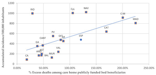 Excess mortality among care home publicly funded bed beneficiaries and accumulated incidence/100,000 inhabitants in each Autonomous Community. Source: Authors’ work using data from the Centro Nacional de Epidemiología [28] and IMSERSO [27].