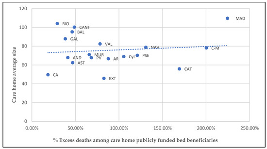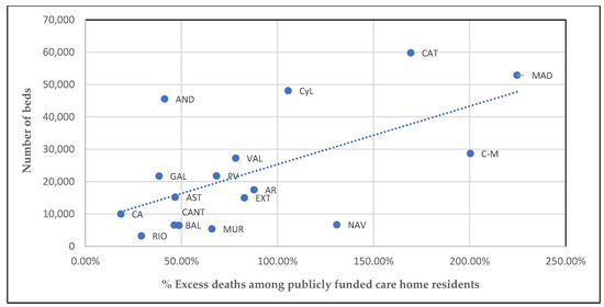 While there is scarce previous evidence on this factor, a few reports suggest an association between the number of available care home beds in a particular region and the infection and death of elderly people in its care homes [32,33]. Figure 3 shows the relationship between excess deaths in care homes and the absolute number of care home beds in each Spanish AC.