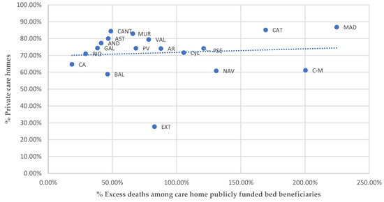 A great deal of research has analysed the impact of the type of care home ownership on COVID-19 outbreaks and mortality and, more specifically, whether private and for-profit status increased their likelihood [38,39,40]. Whereas some authors conclude that the type of ownership may have had a relevant influence [15], others argue that this association is mediated and largely explained by other factors, such as the type of private ownership (big chains) or architectural design [13], the larger size of private homes, and their tendency to be located in urban and suburban areas [29]. Although Figure 5 shows the high proportion of private ownership in most ACs, it does not reveal any clear relationship between the type of ownership and care home excess deaths.