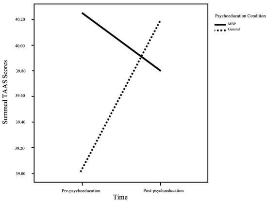 A mixed ANOVA revealed a significant interaction between psychoeducation condition and time on TAAS scores (see Figure 1). Paired samples t-tests evidenced participants in the general psychoeducational condition endorsed statistically significantly higher TAAS scores post-psychoeducation (M = 40.18, SD = 11.37) relative to pre-psychoeducation (M = 39.02, SD = 10.70); t(91) = −3.07, p = 0.003, d = 0.321. Whereas participants presented with the MBP-specific psychoeducation did not evidence statistically significant changes in their perceptions of MBPs acceptability from pre- (M = 40.25, SD = 7.81) to post-psychoeducation (M = 39.80, SD = 10.46); t(95) = 0.75, p = 0.453, d = 0.077. Mixed ANOVA results are displayed in Table 3. The analysis revealed no statistically significant main effect of time, or psychoeducation condition, on TAAS scores.