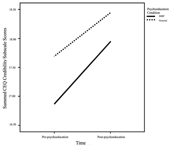 The second mixed ANOVA used summed CEQ Credibility scores as the dependent variable. The interaction between psychoeducation condition and time was not statistically significant, (see Figure 2). Mixed ANOVA results are displayed in Table 3. There was also no statistically significant main effect for psychoeducation condition. However, there was a statistically significant main effect of time, such that post-psychoeducation scores (M = 18.19, SD = 5.75) were significantly higher than pre-psychoeducation scores (M = 17.28, SD = 5.67) across the psychoeducation conditions.