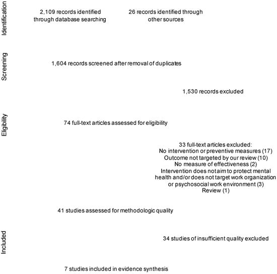 It has been suggested that 44% of hospital turnover could be prevented through hypothetical improvements in the psychosocial work environment []. In their meta-analysis, Panagioti and colleagues [] showed that organization-directed compared to person-directed interventions were more effective in protecting physicians against burnout. Evidence on the effectiveness of work environment interventions in protecting healthcare workers’ mental health in an epidemic or pandemic context is limited. As Muller et al. [] stated in their COVID-19 rapid review, there is “a mismatch between the likely organizational sources of psychological distress […] and how healthcare systems are attempting to relieve distress at an individual level.” A mixed-methods review on interventions (not limited to organizational interventions) covering the period 2002 to 28 May 2020, identified only one study reporting on the effectiveness of workplace-delivered psychological first aid training to frontline healthcare staff to assist the Sierra Leone population after the Ebola outbreak (non-randomized studies were excluded from that review) []. Soklaridis et al. [], covering studies on mental health interventions during epidemics published between 2003 and 31 July 2020, reported mainly on individual-level behavioral interventions (e.g., cognitive behavioral therapy (CBT), music therapy] and on a single organizational intervention among health professionals that has been captured in the present review []. The systematic review by Zace et al. [] covering mental health intervention studies published up to 2 October 2020 included studies that either did not report on effectiveness with respect to a mental health outcome and/or were not directed at the work environment. It is also useful to search for relevant literature published since the aforementioned reviews.