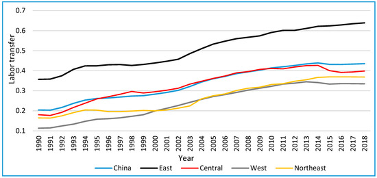Figure 3 shows the ten provinces (municipalities) in the east, which are situated along the coast. Beijing, Jiangsu, Shanghai, and Zhejiang have the highest labor transfer rate, followed by Tianjin, Hebei, Fujian, and Guangdong. Hainan has the lowest labor transfer rate. In Central China, the Shanxi, Henan, Anhui, and Jiangxi provinces close to the east have higher labor transfer rates than Hunan and Hubei. In the west, the provinces (autonomous regions) with high labor transfer rates are Gansu, Ningxia, Qinghai, Sichuan, and Guizhou. In the northeast, the provinces can be ranked based on the labor transfer rate as follows: Liaoning > Heilongjiang > Jilin. In summary, the labor transfer rate is relatively high in economically developed regions in the east, several central provinces close to the developed regions, and western regions in the upper reaches of the Yellow and Yangtze rivers.