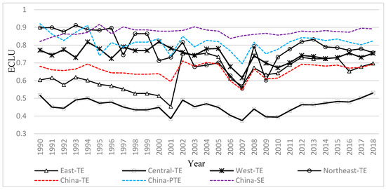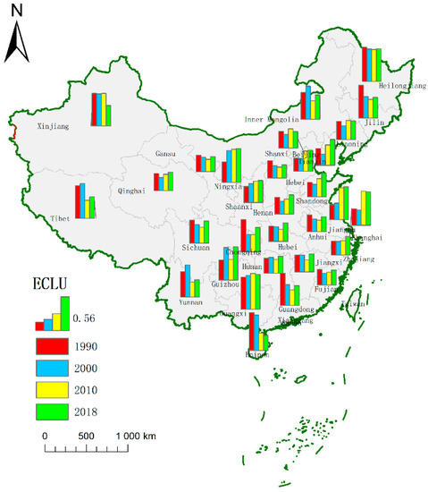 Figure 4 shows that, except for the Hainan Province, the ECLU of Beijing, Shanghai, Tianjin, Hebei, Jiangsu, Zhejiang, and Shandong in the east has been increasing, especially since 2010. In Central China, the ECLU of Hunan, Hubei, and Jiangxi insignificantly changed between 1990 and 2000, but it increased from 1991–2000. The ECLU in most western regions slightly increased after 2000. The ECLU of Xinjiang, Tibet, Inner Mongolia, and the northeastern provinces Jilin and Liaoning significantly fluctuated, but the values of Ningxia and Guangxi were higher.