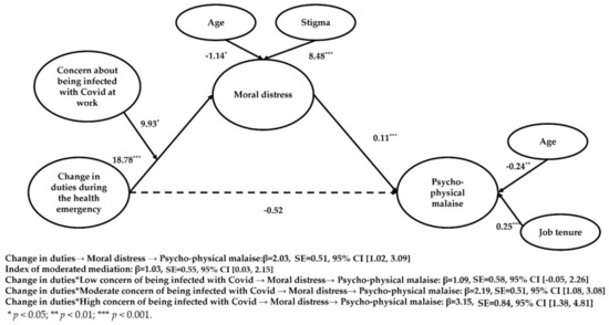 Firstly, power analysis for multiple regression analysis with 10 predictors was conducted in G*Power to determine whether our sample had sufficient size using an alpha of 0.05, a power of 0.95, and a medium effect size (f2 = 0.15). The results indicated that a sample of at least 173 subjects was required, suggesting that our sample size was adequate. As the collinearity statistics (i.e., Tolerance and VIF) were all within accepted limits (between 0.90 and 1.26), the assumption of multicollinearity was met. Examination of the Mahalanobis distance scores indicated that there was no sign of multivariate outliers. Then, a mediation model was conducted to examine whether moral distress would mediate the link between the change in duties and psycho-physical malaise. The results of this model indicated that the change in duties was positively associated with moral distress (β = 18.66, SE = 4.24, p < 0.001, 95% CI [10.31, 27.01]) which, in turn, was positively related to psycho-physical malaise (β = 0.11, SE = 0.01, p < 0.001, 95% CI [0.09, 0.13]) and partially mediated the link between the change in duties and malaise (β = 2.03, SE = 0.51, 95% CI [1.02, 3.09]). The indirect effect was positive, suggesting that professionals who had to change their duties reported greater moral distress which, in turn, was positively related to the psycho-physical malaise.