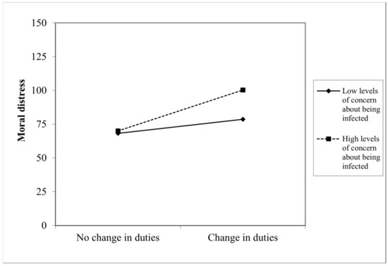 Concern about being infected with the virus during one’s job strengthened the positive association between the change in duties during the emergency and total moral distress (β = 9.93, SE = 5.01, p < 0.05, 95% CI [0.07, 19.80]; see Table 7 and Figure 2). The moderated mediation effect of the change in duties and the concern about being infected through moral distress on psycho-physical malaise was significant for professionals who had high (β = 30.32, SE = 7.21, p > 0.001; 95% CI [16.11, 44.53]) or moderate (β = 20.39, SE = 4.29, p < 0.001; 95% CI [11.97, 28.84]) levels of concern, but not for those who had low levels of concern (β = 10.46, SE = 5.91, p = 0.08, 95% CI [−1.19, 22.10]). Age (β = −1.14, SE = 0.47, p > 0.05; 95% CI [−2.06, −0.21]) and having felt discriminated against (β = 8.48, SE = 2.47, p > 0.001; 95% CI [3.61, 13.34]) because of one’s job correlated with moral distress. Age (β = −0.24, SE = 0.08, p > 0.01; 95% CI [−0.39, −0.09]) and having more experience (β = 0.25, SE = 0.07, p > 0.001; 95% CI [0.11, 0.40]) correlated with psycho-physical malaise. Examination of the interaction plot (see Figure 3) showed that compared to their colleagues with little concern, healthcare providers with great concern about being infected reported a considerable increase in moral distress in the passage from no change in duties to change in duties conditions.