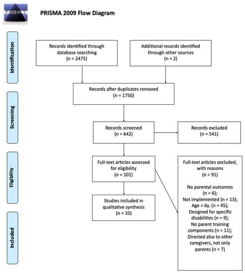 The initial search yielded 2475 studies. After eliminating duplicates, 1750 remained. Following an initial check of the titles and abstracts, 541 studies were rejected, as they did not meet the inclusion criteria, leaving 101 studies to be read thoroughly. Finally, ten studies met all the inclusion criteria and formed the basis for the review. Detailed information was drawn from each relevant article using a researcher-developed data extraction sheet. The following areas were included: (1) authors, year of publication, and country of data collection; (2) information on the implemented program (name of the program, whether it was validated, or if it was adapted from other validated programs); (3) sample characteristics: number of parents enrolled, number of mothers/fathers enrolled, children’s age, and SES background; (4) intervention characteristics: main content of each intervention, research design (randomized controlled trial, pre-post design, follow-up evaluations), in-person/web-based intervention, if the intervention included a group and/or individual training, activities and duration of training, if the intervention included homework for parents, follow-up activities after the intervention, and a control group; (5) measured variables: outcome variables (evaluated with structured observation or with self-report questionnaires), covariates, moderators, acceptability/satisfaction with the program reported by participants; and (6) main results. Four authors coded the data, and the coding procedure was refined via consensus discussions. More specifically, the first five articles were randomly chosen for coding. Discrepancies were resolved via joint reviews and discussions, and minor adjustments were made to the data extraction sheet. The authors then extracted data from ten articles each, and accuracy was jointly assessed by all three of the author-judges. The information extracted from the set of relevant articles is summarized in Table A1 and Table A2 (See Appendix A).