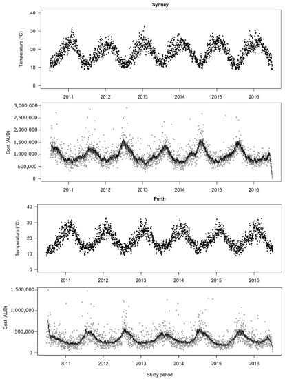 Time-series plots for daily mean temperatures and daily hospitalization costs of respiratory diseases in Sydney and Perth, 2010–2016. Costs are significantly correlated with the temperatures (Spearman rho = −0.49, p < 0.001) in Sydney and (Spearman rho = −0.43, p < 0.001) in Perth. Dark points are daily mean temperatures; Grey points are daily hospitalization costs; Black line is the best fit line generated based on daily hospitalization costs.