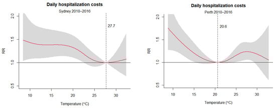 We found there were overall non-linear relationships between ambient temperature exposures and respiratory disease hospitalization costs in Sydney and Perth. Both cold and hot temperatures can increase hospitalization costs, with a higher risk at lower temperatures in both cities. This is consistent with other studies exploring the impact of temperature on morbidity due to respiratory diseases, suggesting more cold-related respiratory diseases than heat-related respiratory diseases [,,,]. Furthermore, the lag0 day exposure to cold is associated with reduced costs for respiratory disease hospitalizations in Sydney. This could be explained by limited human outdoor activities during sudden cold exposure and hence reduced cold exposure and cold-related respiratory disease hospitalization costs, or patients may seek medical care from the emergency department for acute onset conditions such as asthma that were not accounted for hospitalization costs. However, exposure to cold temperatures from 2 days to 12 days is associated with an increase in hospitalization costs for respiratory diseases. Previous studies also showed the delayed cold effect on respiratory diseases, which could persist beyond 2 weeks [,]. In Perth, the trend with reduced hospitalization costs on lag0 day is also apparent, although it was not obvious.