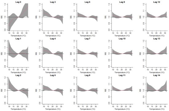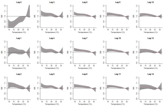 Lag-specific exposure–response curves for daily mean temperatures and respiratory disease hospitalization costs in Perth, 2010–2016. RR is relative risk for respiratory disease hospitalization costs. The red lines represent the lag-specific relative risk, and the grey shaded areas represent the 95% confidence interval.