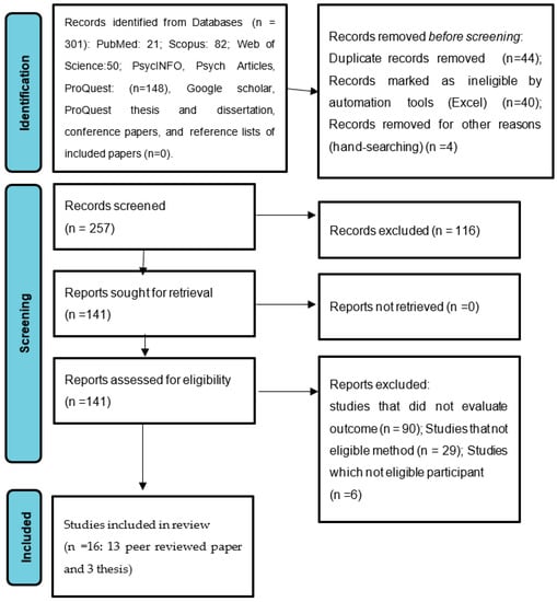 The initial search retrieved 301 studies, and 44 duplicated manuscripts were removed. A further 257 manuscripts were screened based on the title and abstract. No references were added after conducting a search in Google Scholar, ProQuest thesis and dissertation, conference papers, and the reference lists of included papers. Finally, the full texts of 141 manuscripts were reviewed for eligibility criteria. In this process, 13 peer-reviewed manuscripts and three theses were included in the meta-analysis. Figure 1 shows the search process based on the PRISMA flowchart.