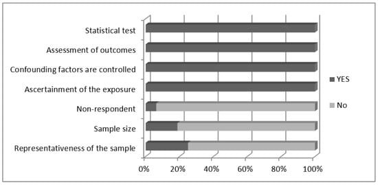 All studies met the criteria for the validated measurement tools, used clear statistical tests to analyze, and self-reported the assessment of outcomes. The most common problems were not reporting the justification or sample size calculation and the number of non-respondents. Overall, 62.5% of the included studies were ranked as having low methodological quality (NOS scores < 5). The total quality scores are provided in Table 1 and Figure 2.