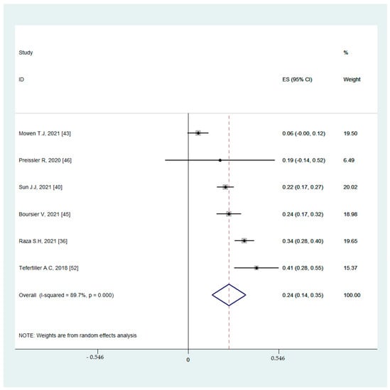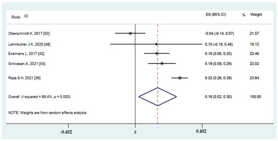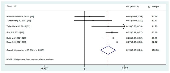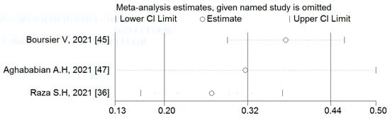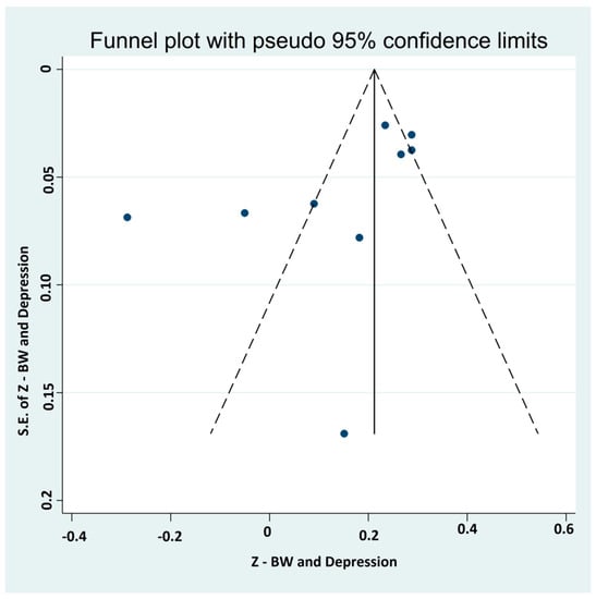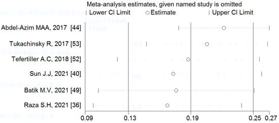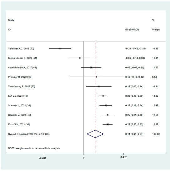 The Newcastle–Ottawa Scale (NOS) was used to assess the risk of bias within the included studies. This checklist evaluates the methodological quality of observational studies in the following three sections: selection, comparability, and outcome []. The maximum acquirable score on the NOS checklist is 9 for each study. Studies with less than five points were classified as having a high risk of bias []. Methodological quality status was not considered as an eligibility criterion. However, the effect of methodological quality on the pooled effect size was assessed in the subgroup analysis and meta-regression.