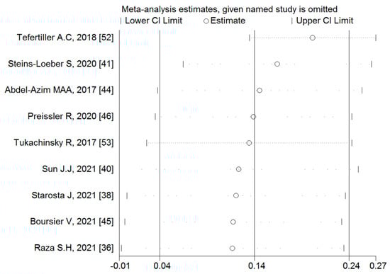 The sensitivity analysis plot assessing the small study effect in the estimated pooled Fisher’s z-score in the association between binge-watching and insomnia.