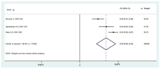The data analysis was conducted using STATA software version 14.0. (College Station, TX, USA). As the included studies were taken from different populations, random effect models were used to conduct the meta-analysis. Random effect models can estimate within- and between-study variances []. The I2 index estimated the heterogeneity across the included studies. Heterogeneity was interpreted as mild with an I2 < 25%, moderate with 25 < I2 < 50%, severe with 50 < I2 < 75%, and highly severe with I2 > 75% [].