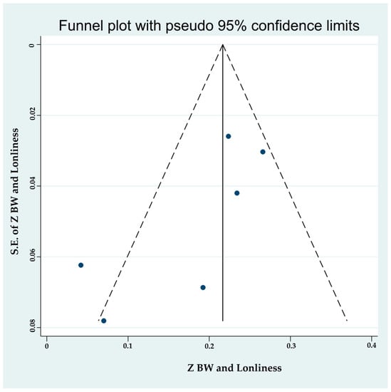 Six studies reported on the associations between binge-watching and loneliness. The pooled estimated ES showed a weak association between binge-watching and loneliness with a Fisher’s z-score of 0.19 [95% CI: 0.13 to 0.25, I2 = 65.2%; Tau2 = 0.01]. Figure 12 provides the forest plot regarding the association between binge-watching and loneliness. Publication bias seems probable based on the Egger’s test (p = 0.08) and symmetrical funnel plot (Figure 13). However, using the fill-and-trim method to correct probable publication bias, no study was imputed, and publication bias was excluded. Sensitivity analysis showed that the pooled ES was not affected by the effect of a single study (Figure 14).