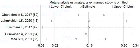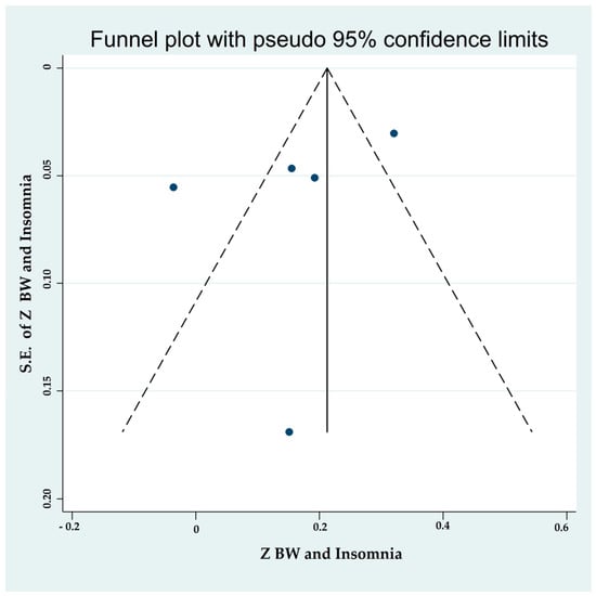 Five studies reported on the associations between binge-watching and insomnia. The pooled estimated ES showed a weak association between binge-watching and insomnia with a Fisher’s z-score of 0.16 [95% CI: 0.03 to 0.30, I2 = 88.4%; Tau2 = 0.02]. Figure 15 provides the forest plot regarding the association between binge-watching and insomnia. Publication bias was not probable based on the Egger’s test (p = 0.34) and symmetrical funnel plot (Figure 16). Sensitivity analyses showed that the pooled ES was not affected by the effect of a single study (Figure 17).