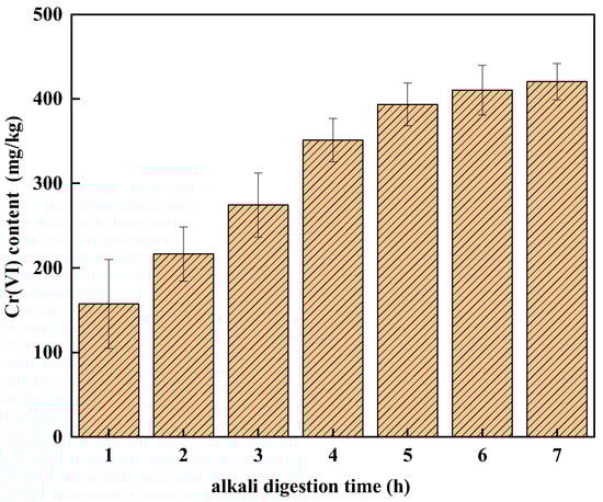 Figure 1 shows the effect of alkali digestion time on the detection of Cr(VI) in soil A. The alkali digestion time has a significant effect on the detection of Cr(VI) in soil A. The amount of Cr(VI) in soil A increased with an increase in digestion time, from 185.01 mg/kg in 1 h to 420.52 mg/kg in 7 h. There are some problems in the determination of Cr(VI) in soil A using the conventional method []. That might be because COPR contains many hydration products, which were thermodynamically unstable in aqueous environments and at ambient temperature, such as hydrogarnet and hydrocalumite [,], the structure of the hydration products was damaged continuously so that more Cr(VI) was released as the digestion time increased. The amount of Cr(VI) detected in soil A increased rapidly in the first 5 h, which changed slowly and tended to be gentle when the digestion time was longer than 5 h. It can be seen that the detection of Cr(VI) reached a stable level when the digestion time reached 6 h and the average amount of Cr(VI) increased by 4.12% and 2.42% from 5 to 6 h and 6 to 7 h, respectively. Because more than 97% of Cr(VI) was extracted in 6 h digestion, 6 h digestion time was chosen in the new method.