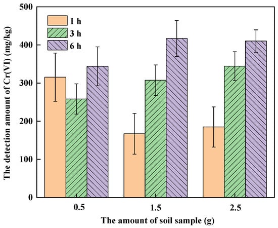 Figure 2 shows the amount of Cr(VI) detected with different quantities of soil A digested for 1, 3 and 6 h, respectively. It can be seen that the quantity of soil sample and digestion time has a great impact on the amount of Cr(VI) detected in soil A. When the quantity of soil A was 0.5 g, the amount of Cr(VI) detected at different digestion times was comparable, although the average of that for 6 h digestion was the highest. When the quantity of soil A for digestion was 1.5 g and 2.5 g, the amount of Cr(VI) detected increased with the digestion time. This is consistent with the results of the digestion time effect experiment. When the soil amount was 0.5 g, the average amounts of Cr(VI) detected at 3 h and 6 h were lower than those when the soil amount was 1.5 g and 2.5 g. That might be because that real soil is a complex ecosystem, comprising minerals, organic matter, microorganisms and other solid components []. That is to say, soil is heterogeneous and for lesser quantities of soil, it was difficult to represent the properties of soil, which increased the contingency of the experiment. Therefore, the 2.5 g soil sample was selected for digestion to determine the amount of Cr(VI) in soil, which is the same as the conventional alkaline digestion method.