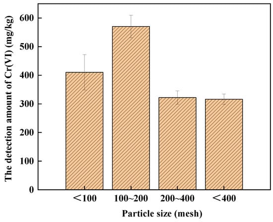 The effect of particle size on Cr(VI) detection in soil A is shown in Figure 3. The amounts of Cr(VI) in soil A with different particle sizes of <100, 100–200, 200–400 and <400 mesh were 410.33 mg/kg, 570.33 mg/kg, 322.14 mg/kg and 316.10 mg/kg, respectively. The amount of Cr(VI) detected in soil A with the mesh of 100–200 was the highest. The reason might be that soil A mainly comprises COPR, which is difficult to break [,]. Therefore, the mesh of <100 is the best choice for alkali digestion.