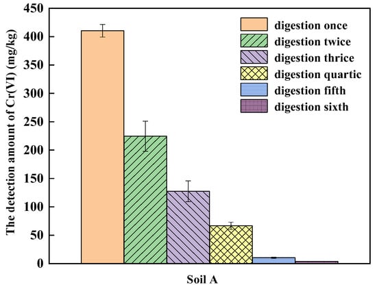 According to the above experiments, the 2.5 g sample with a particle size less than 100 mesh and 6 h digestion time was chosen for alkaline digestion and then multiple alkali digestion was conducted. As shown in Figure 4, as the rounds of alkali digestion increased, the amount of Cr(VI) in soil A decreased gradually, and Cr(VI) can still be detected after conducting digestion for six times. Hexavalent chromium in COPR is mainly embedded in silicate minerals, which are not easily dissolved during alkali digestion []. In the last two alkali digestion processes, the amount of Cr(VI) in soil A decreased to 10.35 mg/kg and 3.65 mg/kg, accounting for 1.25% and 0.44% of the total amount of Cr(VI) from the six digestion rounds, which means that the amount of Cr(VI) detected by the first four rounds of digestion accounted for more than 98% of the total amount. Considering detection accuracy and time consumption, multiple alkali digestion was employed to detect the amount of Cr(VI) in the soil until the amount of Cr(VI) in the last extraction was less than 10% of the total amount of Cr(VI).