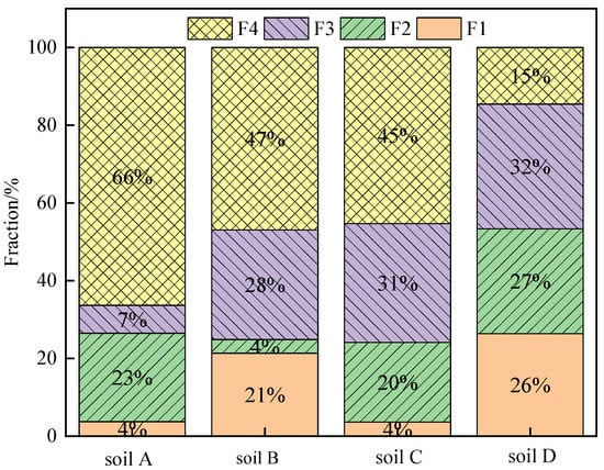 F1, F2 and F3 are the main bioavailable forms, in which F1 and F2 are sensitive to environmental changes, easy to migrate and transform and easy to release under acidic conditions, and F3 has strong binding ability to soil organic matter. Therefore, it is easy for plants to extract and utilize them, while, in comparison, F4 is more stable in nature []. However, previous study has shown that the residual fraction of Cr could be transformed into mild acid-soluble fraction, reducible fraction and oxidizable fraction of Cr during alkali digestion []. For soil A, that the amount of Cr(VI) detected by the new method and the conventional method exhibited significant differences, which might be due to its high content of residual fraction. The release of Cr(VI) in residual fraction is slow, leading to inaccuracy in the conventional method. While for soil D, the residual fraction only accounts for 14.59%, the amount of Cr(VI) detected by the new method increased by 15.21% compared to the conventional method.