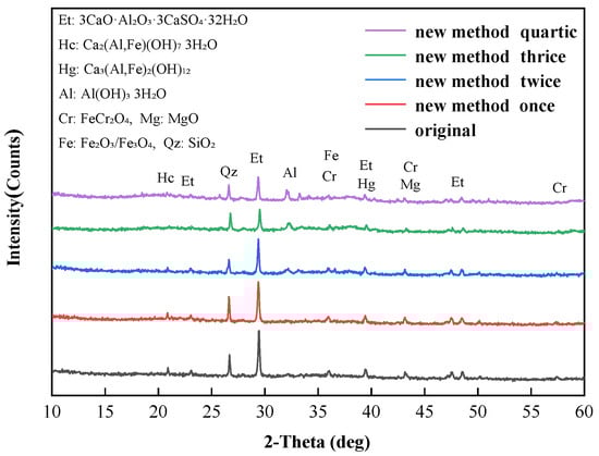 The XRD patterns of soil A with different multiple alkali digestion processes are shown in Figure 7. The main crystallization peak in soil A was ettringite (3CaO·Al2O3·3CaSO4·32H2O, 23.07°, 29.35°, 39.34° and 48.50°), followed by hydrogarnet (Ca3(Al,Fe)2(OH)12, 39.34°), hydrocalumite (Ca2(Al,Fe)(OH)7·3H2O, 20.89°), gibbsite (Al(OH)3·3H2O, 32.02°), chromite (FeCr2O4, 35.97°, 43.12° and 57.42°), maghemite/magnetite (Fe2O3/Fe3O4, 35.97°) and quartz (SiO2, 26.61°). The crystallization peak corresponding to hydrogarnet, hydrocalumite and ettringite gradually decreased with the increase in alkali digestion round. Some studies showed that hydrogarnet and hydrocalumite were hydration products, which were thermodynamically unstable in aqueous environments and at ambient temperature [,] and ettringite can be gradually eroded by Na2CO3 []. During the multiple digestion process, the Cr(VI) embedded in ettringite and other mineral phase structures gradually released with the dissolution of minerals [].