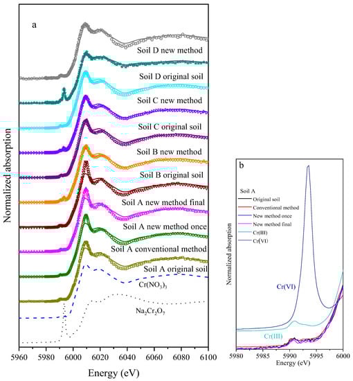 Moreover, the conventional method has some problems in detecting Cr-contaminated soil in the actual site, which cannot extract all the Cr(VI) in COPR, since Cr(VI) is usually embedded in the mineral phase structure, such as silicate, which is difficult to extract, leading to a large deviation in the detection results [,,,]. Dermatas et al. [] discovered that the method of X-ray absorption near the edge structure in spectroscopy (XANES) and the pre-treatment method of USEPA 3060A had a great difference in the detection of Cr(VI). Malherbe et al. [] pointed out that, compared with the XANES analysis method, the conventional method underestimated the Cr(VI) content in the Cr-contaminated soil. These studies suggest that there are certain limits in the extraction of Cr(VI) from soil by the conventional alkaline digestion method, which leads to an inaccurate detection result of Cr(VI). Although XANES is a powerful tool that can distinguish between Cr(III) and Cr(VI), unfortunately, synchrotron radiation facilities are rare and expensive, which could not be used frequently during remedial project. Therefore, it is necessary to develop an appropriate and reliable method to extract Cr(VI) from Cr-contaminated soils, especially soils mixed with COPR.