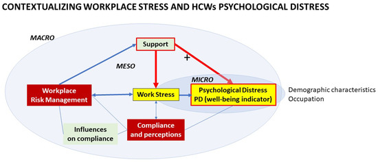 By applying a systems approach [31] to the growing scholarly literature on the effects of COVID-19 on HCWs’ mental health, the conceptual framework central to our investigation (Figure 1) is that the experience of PD at a personal (micro) level is directly and indirectly associated with the presence of job-related stresses, occupational health and safety risk management systems, and support systems (such as training or personal relationships) at an organizational (meso) level that occur in distinct national and local macro-level contexts.
